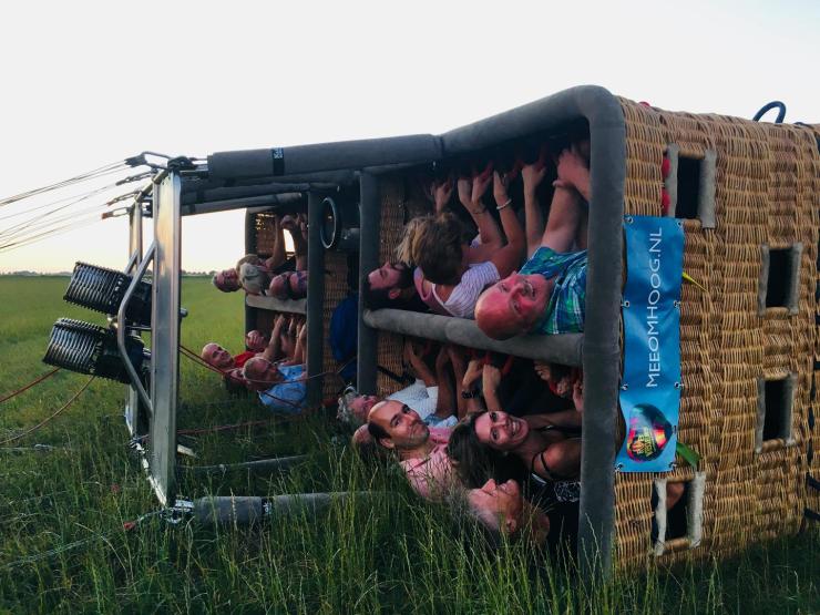 De piloot zal voor de landing de instructies nogmaals met u doornemen om u voor te bereiden op de landing. Het is altijd de intentie om op een gemaaid veld te landen in de buurt van een hekje. Zodra er een geschikt veld in zicht is zet de piloot de landing in. De volgploeg zal vervolgens toestemming vragen aan de landeigenaar om de ballon te mogen bergen. Na toestemming pakken wij de ballon gezamenlijk in. Wij zorgen er daarna voor dat wij niet langer dan nodig in het weiland blijven. We sluiten de avond gezamenlijk af met een glas champagne terwijl we terugkijken op een prachtige ervaring. Wanneer u zelf vervoer heeft, neemt de piloot ter plekke afscheid van u en anders brengen wij u terug naar de startlocatie.